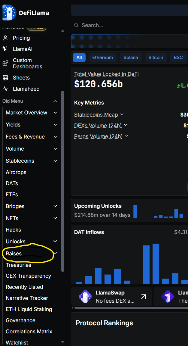 Defilama is a data dashboard that tracks many things, but what we are looking for is the “Raises” (in the old menu) > Overview selection.